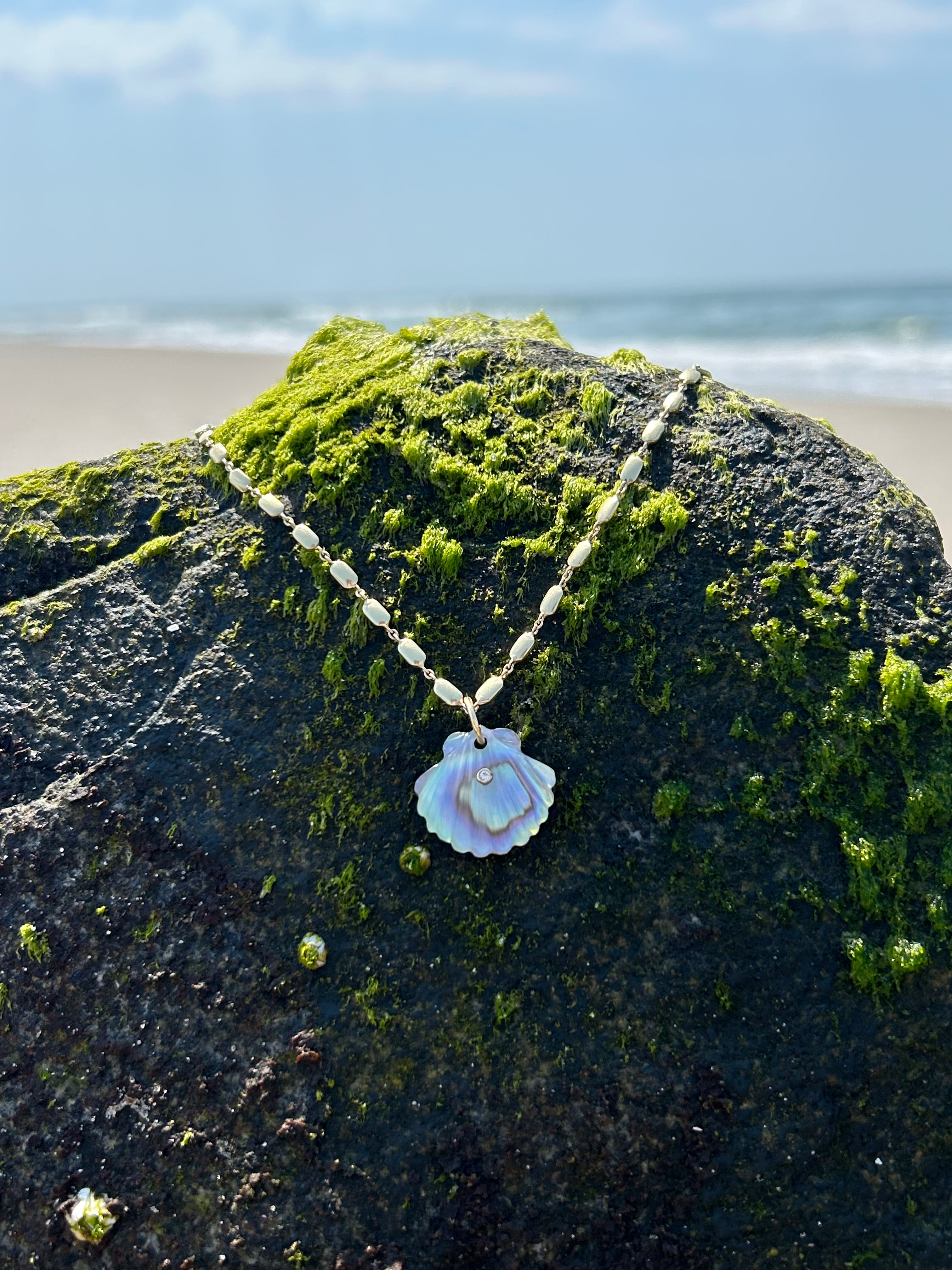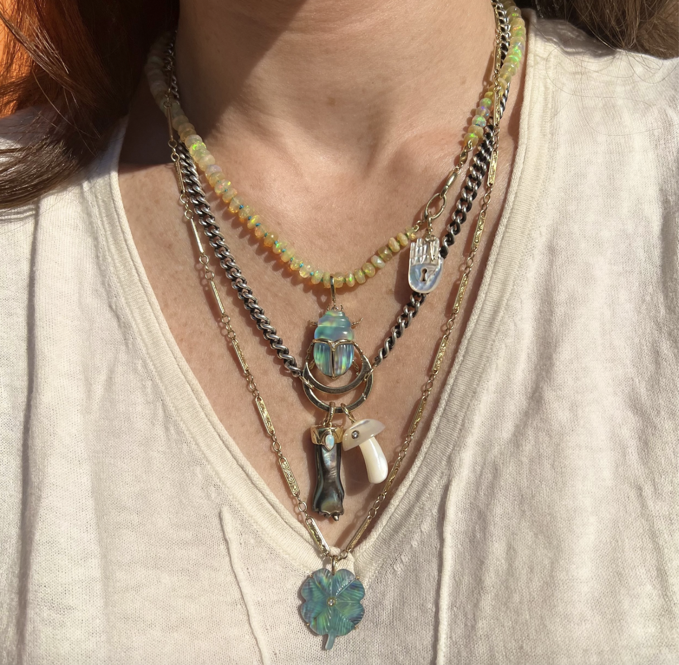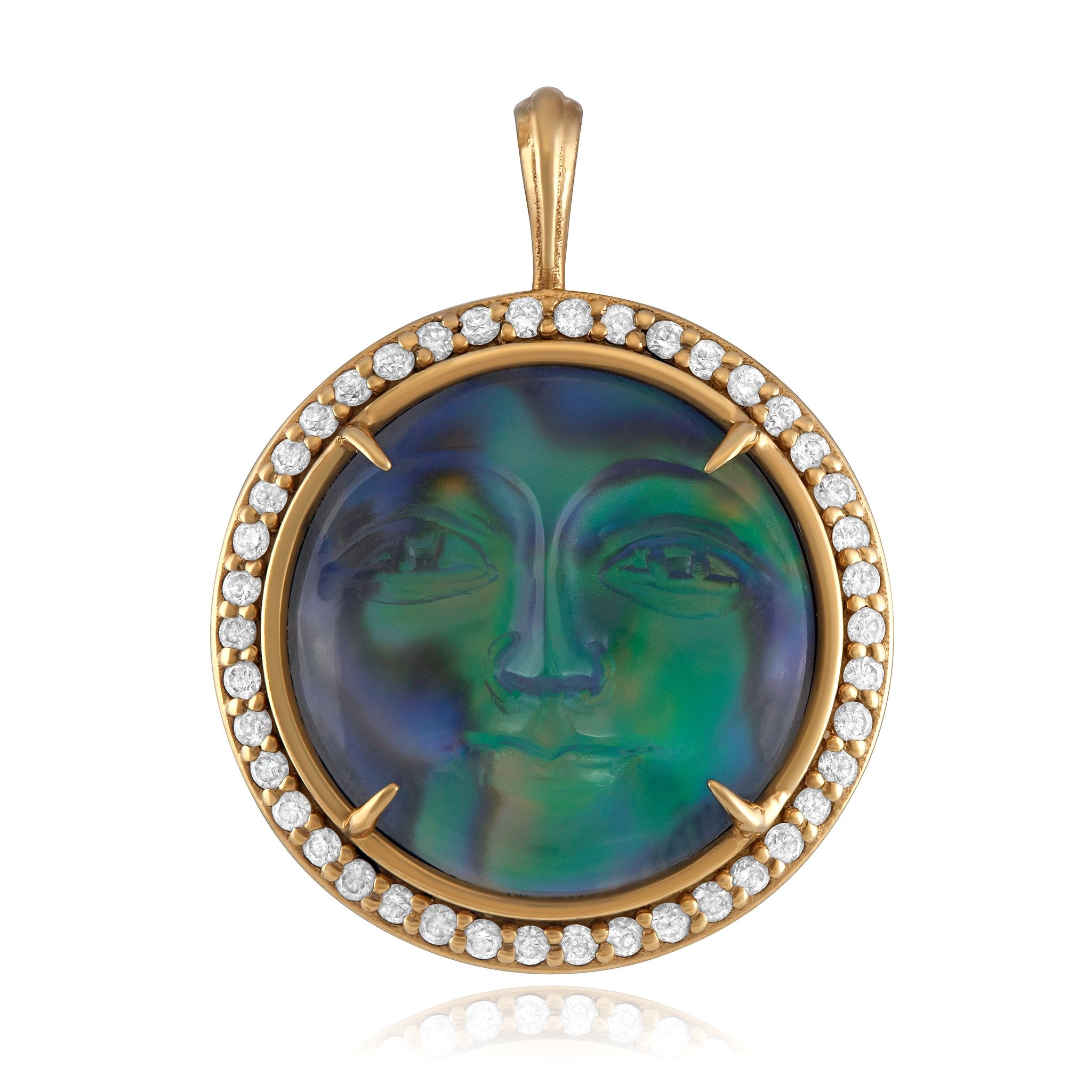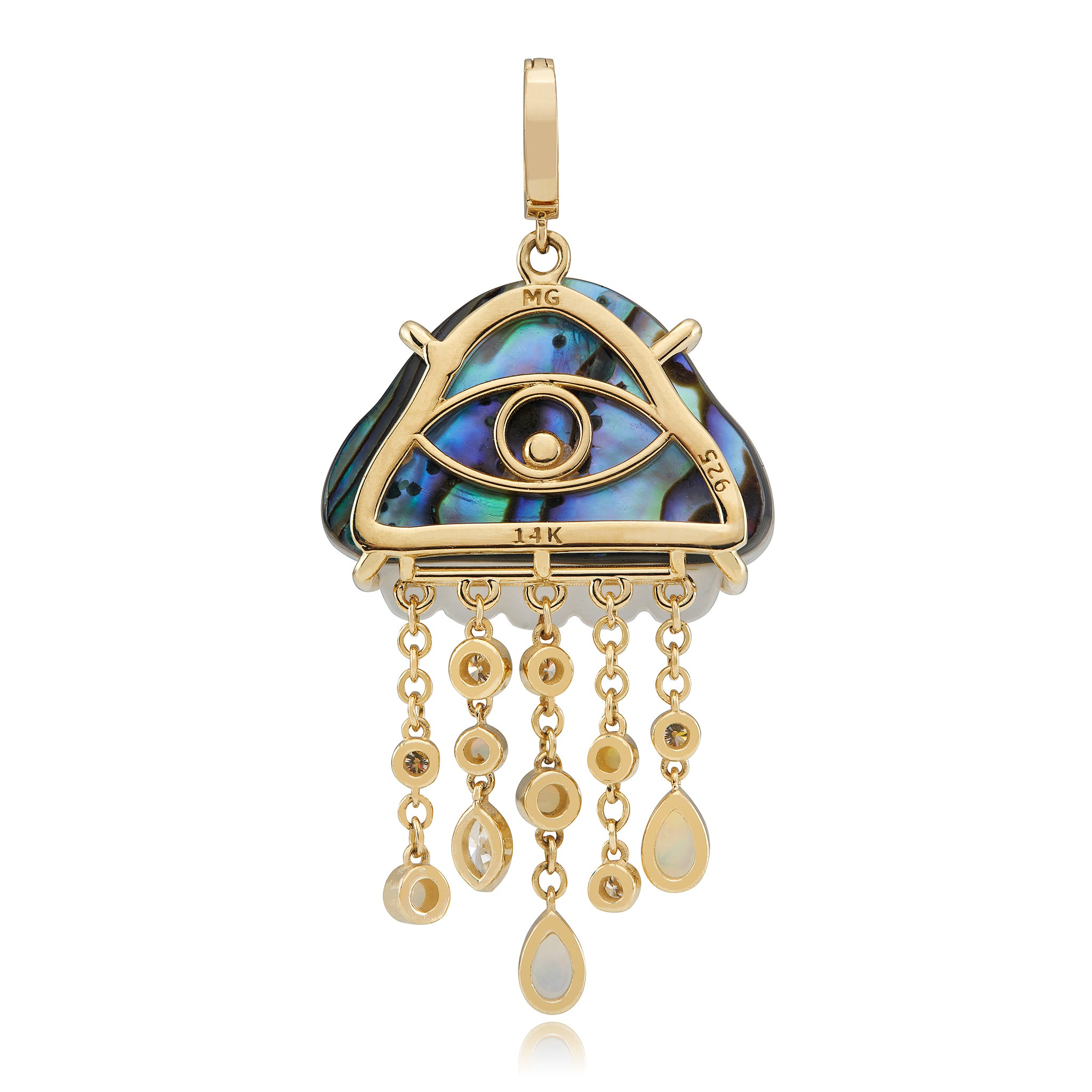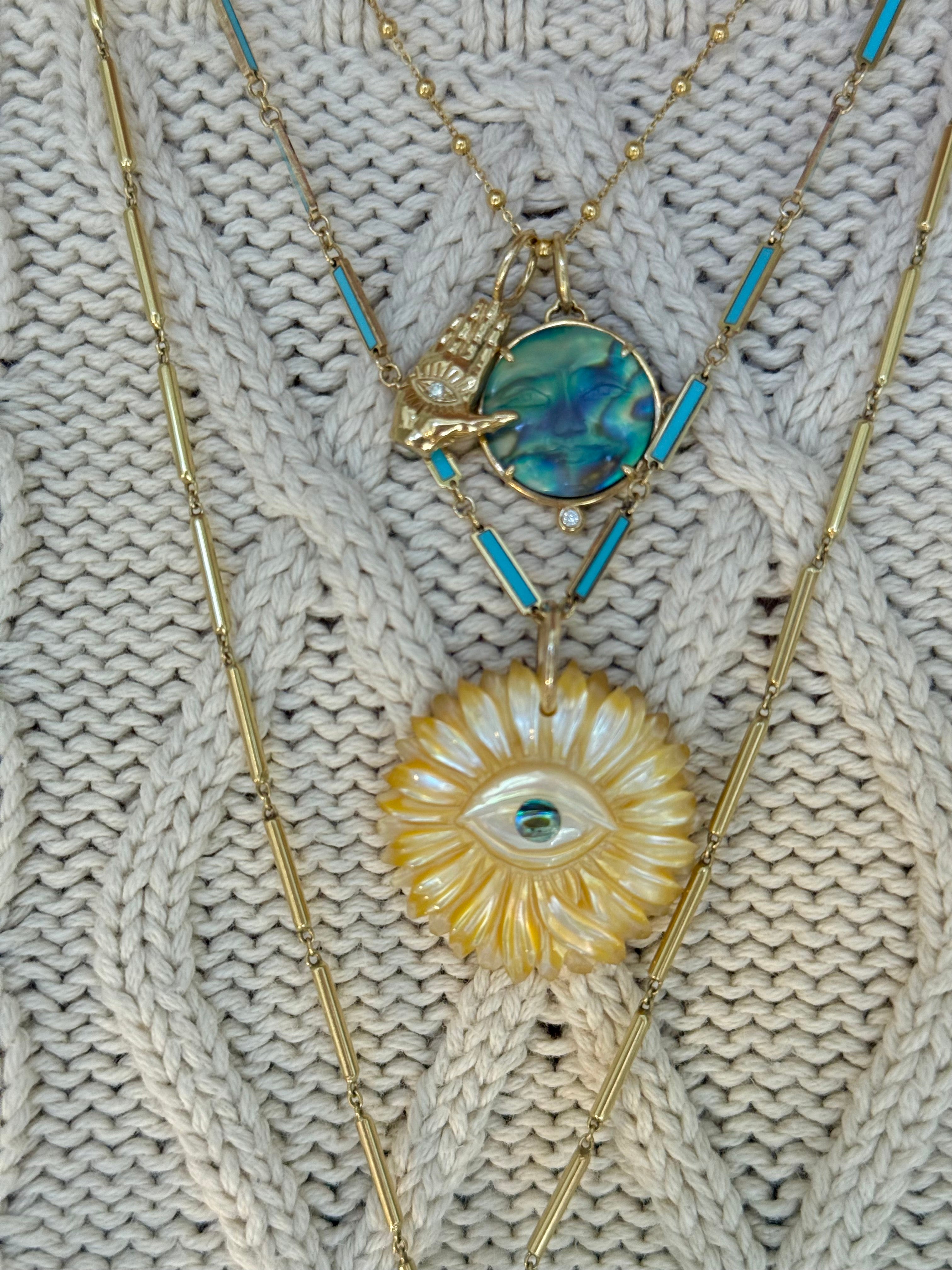 Who can help but marvel at the soft, blinking glow of fireflies on a warm summer night or waves of shimmering tentacled jellyfish floating in the dark ocean depths? Maura’s Luminescence Collection recreates the mystery of bioluminescence by carefully positioning a hand-carved layer of semi-translucent white chalcedony over a foundation of iridescent abalone, creating the effect of a hazy glow emanating from within the pendant itself. Choose the design that reflects your unique personality and let your inner light shine.